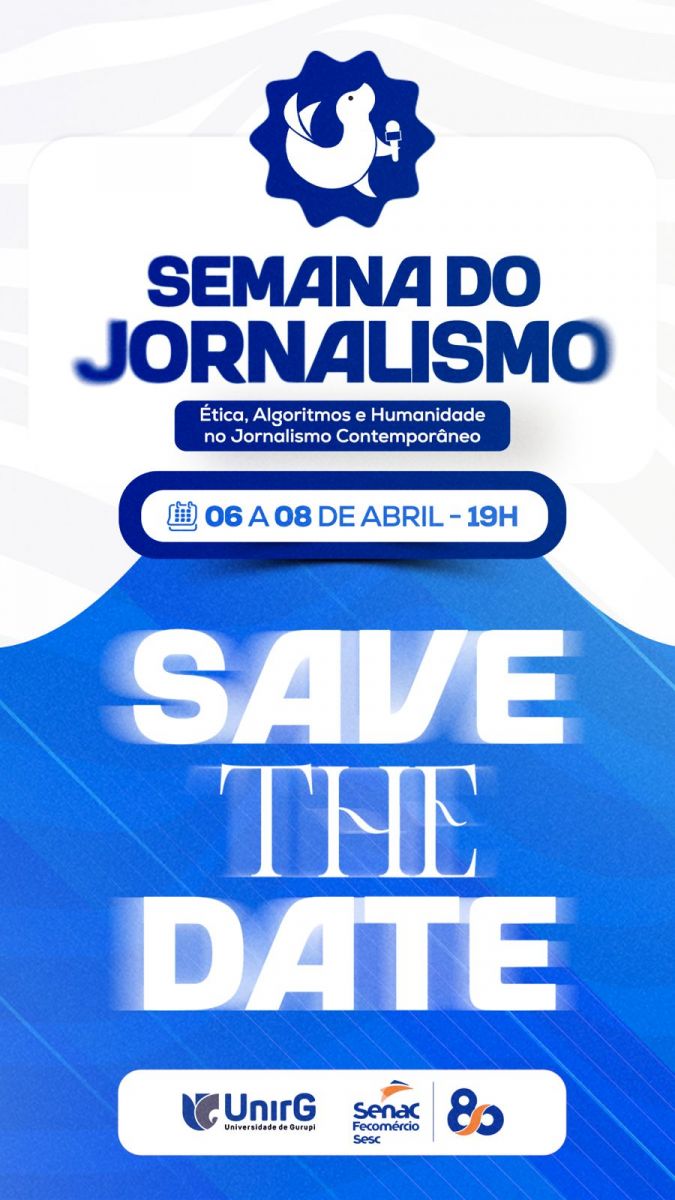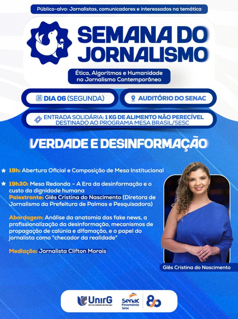 Entre os dias 06 e 08 de abril, a Universidade de Gurupi – UnirG promove a Semana do Jornalista, com o tema “Conexões Necessárias: Ética, Algoritmos e Humanidade no Jornalismo Contemporâneo”. O evento será realizado das 19h às 22h, no auditório do Senac, em Gurupi/TO, reunindo jornalistas, estudantes e interessados na área da comunicação.