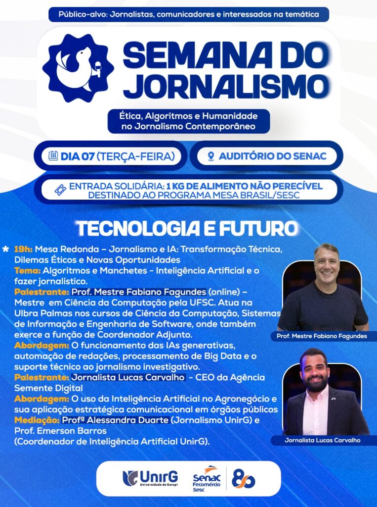Na terça-feira, 07, o foco será tecnologia, com destaque para a mesa “Jornalismo e IA: Transformação Técnica, Dilemas Éticos e Novas Oportunidades”. Entre os palestrantes, estão o professor Me. Fabiano Fagundes, que abordará o funcionamento das inteligências artificiais e suas aplicações no jornalismo, e o jornalista Lucas Carvalho, que discutirá o uso da IA no agronegócio e sua aplicação estratégica em órgãos públicos.