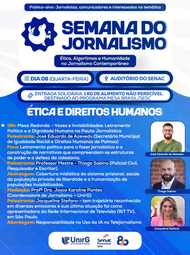 Encerrando a programação, na quarta-feira, 08, o evento traz à tona reflexões sobre ética e direitos humanos, com a mesa “Vozes e Invisibilidades: Letramento Político e a Dignidade Humana na Pauta Jornalística”. O debate contará com a participação do Secretário de Igualdade Racial e Direitos Humanos Secretário, José Eduardo de Azevedo, que abordará o letramento político no fazer jornalístico e a defesa da cidadania; do professor mestre Thiago Sabino, que discutirá a cobertura midiática do sistema prisional e a humanização de populações invisibilizadas; e da jornalista Jacqueline Stefano, que tratará da responsabilidade no uso da inteligência artificial no telejornalismo.